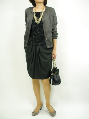 ダークカラーのシックな装いは、光沢感やキラキラの質感でメリハリをつけて。丸味のあるジャケットのシルエットが今年らしいですね!エレガンス度80%、スタイリッシュ度20%。