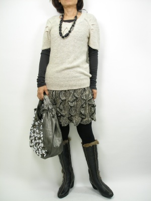 ひらひらミニには、少しルーズなニットが可愛いバランス。アクセサリーはニットに負けないボリュームのあるタイプを!フェミニン度90%、スタイリッシュ度10%。