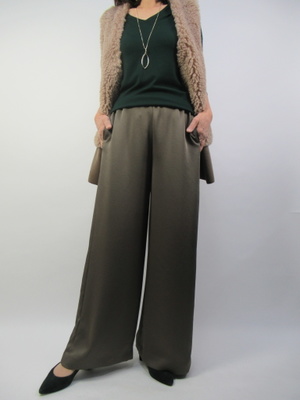 カーキ系のトーンでまとめたパンツコーデ。フェイクファーのベストがグリーンのニットにぴったり。エストの裾にはファーがついていないのですっきりした印象になります!スタイリッシュ度80%、エレガンス度20%。