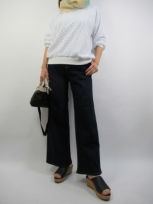 ワイドのデニムを白のカットソーでシンプルに。アクセントは黄色系のストールを巻くだけで白×ネイビーのバランスが取れたおしゃれデイリーファッションになる!アクティブ度80%、スタイリッシュ度20%。