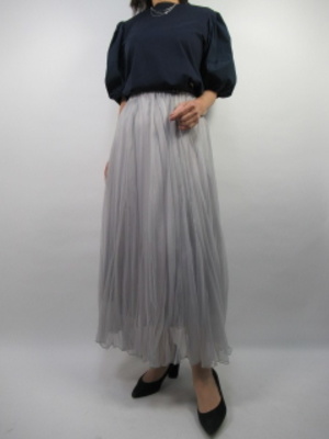 袖ボリュームのカットソーにシフォンのふんわりギャザースカートをあわせる。ネイビーとグレーのシックなトーンでまとめれば甘口トーンも落ち着いた大人のコーデになる!フェミニン度60%、エレガンス度40%。