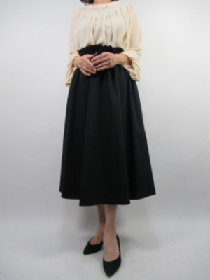 ボリュウム袖もとろみのある生地だと落ち感が出て柔らかな印象になる。スカートはウエストギャザーでメリハリをつけたデザインでフェミニンなブラウスコーデに!フェミン度70%、エレガンス度30%。