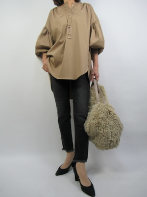 色デザイン・・。とても多く出ている注目のボリューム袖ブラウスは上品な大人のキャメル色でシックな印象にまとめると子供っぽくならない!スタイリッシュ度60%、エレガンス度40%。