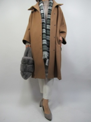 流行りのポンチョをコートに取り入れたオシャレな一着。上品なキャメル色なので白のパンツととても相性が良い。冬のコートファッションにトレンド感を出したコーディネート!スタイリッシュ度60%、カジュアル度40%。。