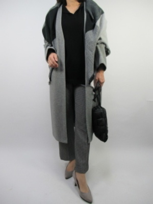 黒のドットパンツに黒のニットでシンプルに。ざっくりタイプのコクーンスタイルコートを羽織れば黒×グレーのスタイリッシュなコーデになる!スタイリッシュ度70%、エレガンス度30%。