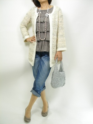 上品なツイードジャケットにボーイフレンドデニムを合わせた流行りの着こなし。ロールアップで足首を見せるのがポイントです!フェミニン度80%、アクティブ度20%。