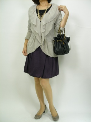 フリフリカーデもこんな細身タイプならシックにまとまります。ウエストを絞っておけば膝丈スカートもバランスが良く見えます!エレガンス度80%、スタイリッシュ度20%。