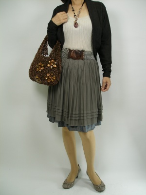 ドルマン袖のボレロを上品にスカートでコーディネート。バッグのゴールドがとても印象的なレンチファッション!フェミニン度100%。