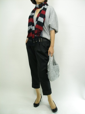 少しゆったりしたリラックスモードなシルエット。グレーと黒の組合せに映える赤のマフラーが、マニッシュな雰囲気でクール!スタイリッシュ度90%、フェミニン度10%。