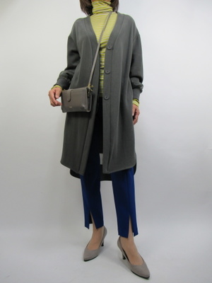 (鮮やかなブルーのパンツでメリハリコーデ)ブルー×イエローの組み合わせがとても新鮮ですね。合わせたコーディガンには袖を通すと裾に透け感があるデザインです。