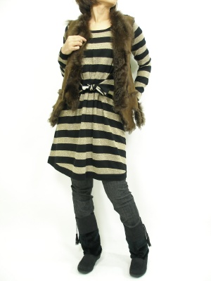 キラキラのゴールドラメのカッコいいワンピにあえてワイルドなファーベストを合わせて。ボリュームのあるブーツならバランスが取れます!アクティブ度70%、スタイリッシュ度30%。