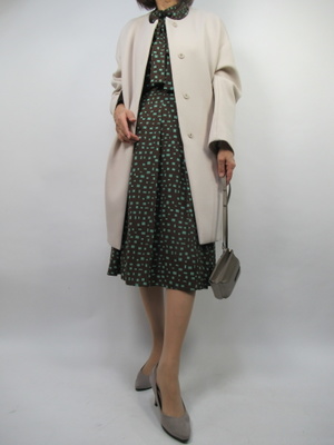 (ブラウスとスカートのツーピースコーデ)単品でももちろん使えますがセットでツーピースとして着用すればきちんとしたよそ行きファッションに。コートを羽織れば年末年始のお出かけにとても重宝するセットアップです。