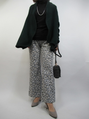 (柄のパンツをおしゃれに投入)柄パンツは今季よく登場する必須アイテム。ブーツカットで脚長効果のある一枚。暖かい着流しカーデでシンプルなスタイリッシュコーデ。