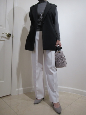 (ジレファッションでスタイリッシュに)テーラード襟の短丈ジレをソフトワイドパンツに合わせてスタイリッシュモダンの大人っぽいコーディネートです。