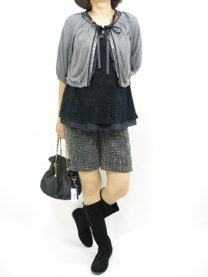 ボレロとショートパンツで作るコンパクトなコーディネートは、可愛さをキープしつつスラリと見せてくれます!フェミニン度90%、エレガンス度10%。