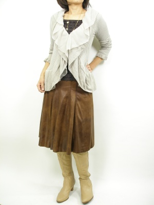 フリルがフェミニンな細身カーデは着やせ効果もあり。フェイクレザーのスカートで甘さを中和させるとオシャレですね!フェミニン度80%、スタイリッシュ度20%。