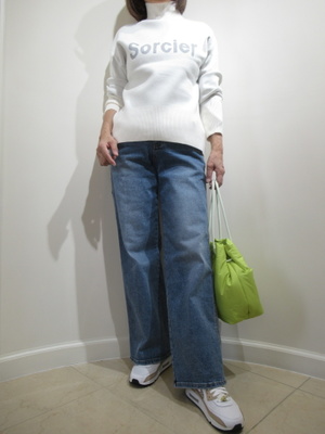 (ボーイズデニムでデイリーファッション)ボーイズデニムにざっくりニットで普段着のオシャレを楽しんで。スニーカーによく合うコーディネート。
