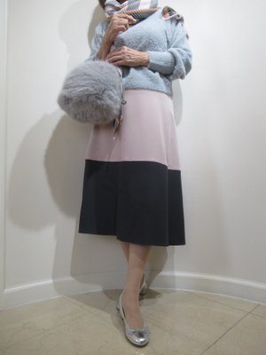(配色スカートでフェミニンに)Aラインの配色スカートをシルバーのニットで華やかさをプラス。ストールの色のスカートの色にリンクさせてみました。