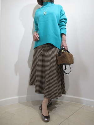 (きれいなニットで華やかに)フレアのスカートにきれい色のニットとざっくり合わせたフェミニンスタイル。ファーのバッグをアクセントに。