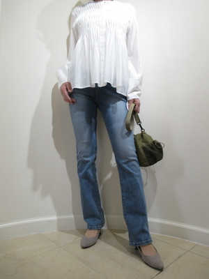 (細身フレアデニムでカジュアルに)細く裾がフレアのデニム。ちょっとなつかしいデザインが復活してきました。シンプルに白のブラウスでカジュアルに。
