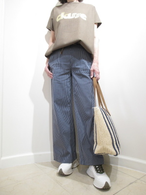 (ヒッコリーのパンツでカジュアルに)ヒッコリー生地のカジュアルパンツ。やや丈は短め。ざっくりデザインのブラウスカットソーで楽ちんコーデに。