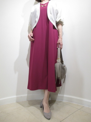 (Aラインのエレガントワンピ)ボルドーのシックな色のワンピース。Aラインのエレガントなシルエットが特徴。ボルドーによく合うグレージュの羽織りをチョイスして。