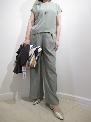 (アッシュローブのパンツアンサンブル)柔らかで光沢のある生地を使用したパンツとブラウスセットで着用するとスタイリッシュなシルエットでとてもおしゃれ感のある組み合わせです。