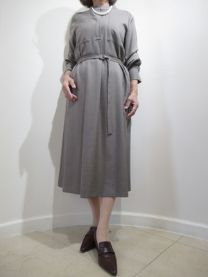 (きちんと感のあるシャツワンピース)ノーカラーのシャツワンピース。ウェストは共布のベルト有り。シンプルなデザインなのでオンオフとも使える1枚。手洗いできるのもうれしいですね。