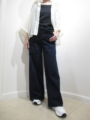 (ワイドデニムをカジュアルに)裾は切りっぱなしのワイドデニムはスニーカーでカジュアルに合わせたい。トップスは透け感のあるシャツで羽織にしてみました。