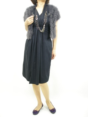 ウエストをギュッと絞ったセクシーなワンピじゃ毛足の長いキュートなボレロで露出を調節してパーティーへ!エレガンス度70%、スタイリッシュ度30%。