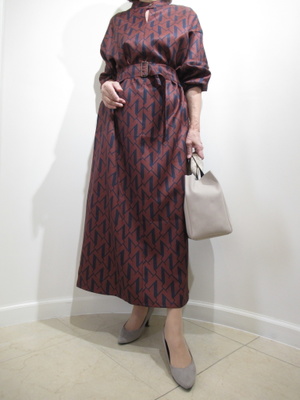 (幾何学模様のワンピース)襟無しでウェストをサッシュベルトでマークしたシンプルな一枚。茶系は今年の秋の流行。幾何学模様のデザインがこのワンピースにはよく合っていますね。