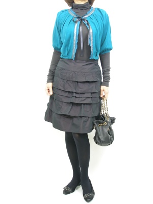 ボレロとティアードスカートの最高の組合せ。インナーの濃淡タートルでちょっと引き締めて丁度良いバランスに!フェミニン度90%、スタイリッシュ度10%。