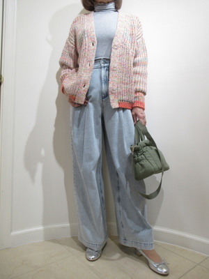 (ミックスツィードのカーデをデニムに)おしゃれなミックスツィードのカーデ。ざっくり感がとてもナチュラル。淡い色のデニムで合わせてみました。