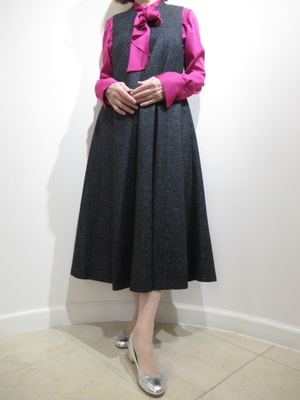 (華やかさと上品さを両立した特別感のあるコーデ)深みのあるチャコールブラックのジャンパースカートに鮮やかなパープルピンクのボウタイブラウスを合わせて大人の華やぎをプラス。動くたび、ふわっと揺れるシルエットが、女性らしさを一段と引き立てます。足元はシルバーのパンプスで品よく軽さもプラス。お食事・お呼ばれ・お出かけまで幅広く活躍するおすすめスタイルです。