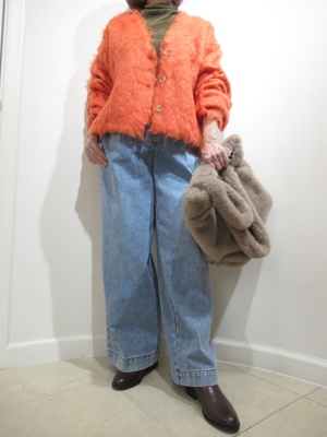(冬のデニムコーデを明るく彩る、オレンジカーディガン)ふわもこのカーディガンが冬の装いを一気に華やかにしてくれる主役アイテム。ビビッドなオレンジが顔周りをパッと明るく見せ、デニムとの相性も抜群です。ボトムはゆったりワイドデニムで大人の余裕を感じるカジュアルに。
