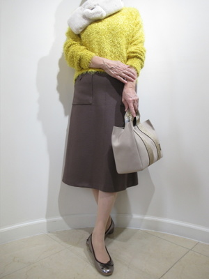 (ふんわりイエローニット)ふわっと華やぐイエローのニットが、冬の装いを一瞬で明るくしてくれる主役アイテム。上品なブラウンのスカートと合わせることで派手にならず大人の女性らしい柔らかさを演出します。軽くて暖かなファーマフラーを添えれば、季節感とエレガントがさらにアップ。
