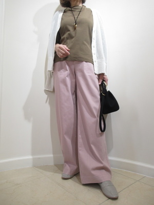 (ピンクのワイドパンツでお出かけ)やわらかなホワイトのカーディガンが全体を上品に包み込むコーデ。ブラウンのインナーで落ち着きを添え、大人のナチュラル配色に。淡いピンクのワイドパンツが、優しさと華やかさをさりげなくプラス。足元はグレージュでまとめて、すっきりと洗練された印象に。リラックス感がありながらも、きちんと見えする春のお出かけスタイルです。