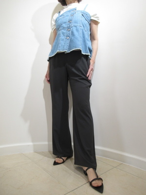 (デニム素材のキャミトップス)デニム素材のキャミトップスに、すっきりとしたシルエットのワイドパンツを合わせたコーデ。キャミが程よく広がるデザインなので、気になる部分をカバーしつつ自然とバランスの取れたスタイルが仕上がります。