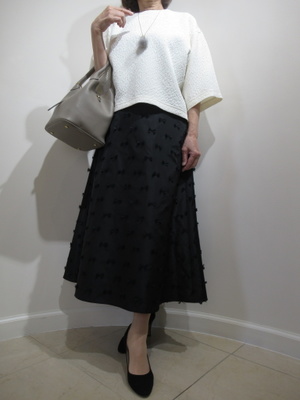 (ちょっとおしゃれにしたい日のコーデ)Aラインのスカートは細かいリボンをあしらったエレガントな生地です。トップスもふくれ織りのおしゃれな生地が特徴で上下合わせてとてもおしゃれなお出かけコーデの完成。
