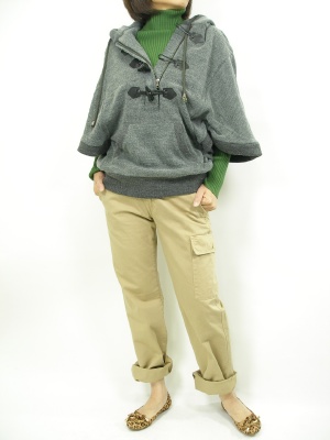 お袖たっぷりのポンチョタイプは、とっても動きやすくて しかも体型カバーできてしまいます。インナーはリブニットにすると腕が細く見える効果もあり、です!アクティブ度100%。