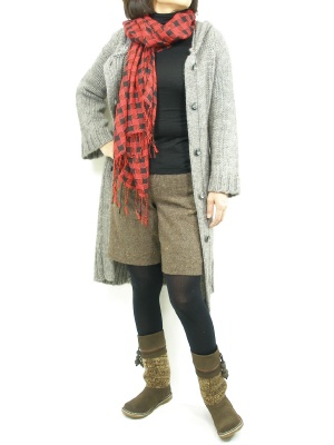 ローゲージのニットコートには、ショートパンツを合わせてアクティブに。重めアウターには軽いボトムがオシャレに見せるコツ!アクティブ度100%。