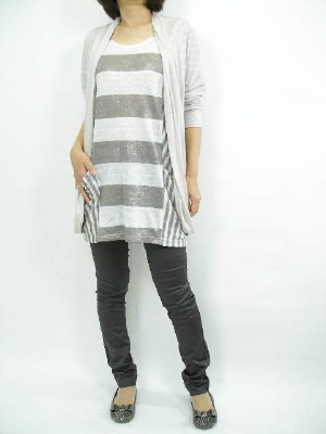 ゆるチュニックにドレープカーディ・・。リラックスしたコーディネートが旬です。ボトムスはレギンスでメリハリを付けて!アクティブ度80%、スタイリッシュ度20%。