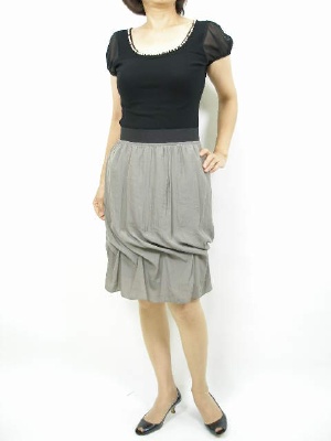 裾の捻りが効いたスカートはそれだけでお洒落。トップスはシンプルキュートなニットを合わせて。首回りにパールをあしらったデザインでアクセいらず!フェミニン度100%。