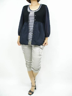 異素材を組み合わせたブラウスやシャイニーなパンツで、夏とはひと味違う秋のマリンスタイルに!フェミニン度60%、アクティブ度40%。