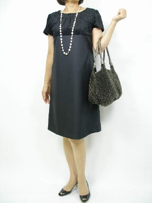 上部分のお花模様と刺繍が柔らかさを出し、平型パールのネックレスとのコントラストが涼しさを演出!エレガンス度80%、フェミニン度20%。