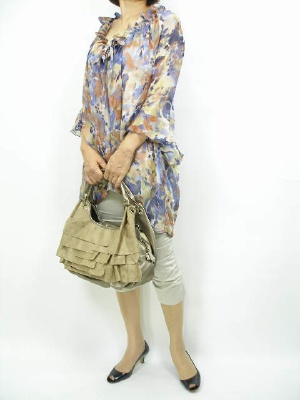 変形のブラウスは体のラインを上手に隠してくれる。それでいてオシャレな一着。細身のパンツでスッキリと見せて・・。スタイリッシュ度100%。