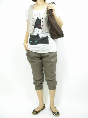 ポップな図柄のカットソーを短丈ベストでコーディネート。バッグは流行りのフェイクムートンでカジュアルに。秋のお出かけが楽しくなりますね!アクティブ度80%、スタイリッシュ度20%。