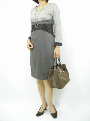 ツートンのグレーをこげ茶で引き締めて大人っぽく。大振りのトップのアクセで華やかさを足してランチファッションに!エレガンス度90%、スタイリッシュ度10%。