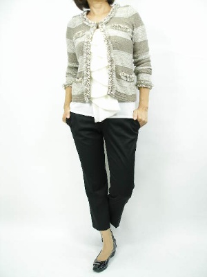 根強い人気のパールトリミングニットジャケット。シンプルなパンツで、スッキリカッコ良く!スタイリッシュ度80%、エレガンス度20%。
