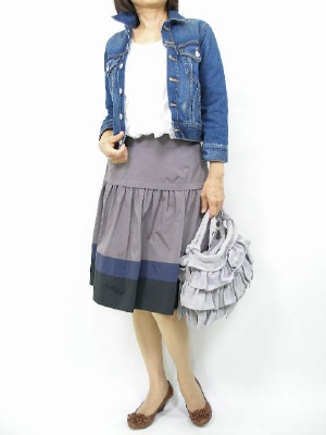大きなリボンがポイントのスカートは甘く仕上げたい。サークル編みのキュートなカーディでまとめて・・。フェミニン度90%、エレガンス度10%。